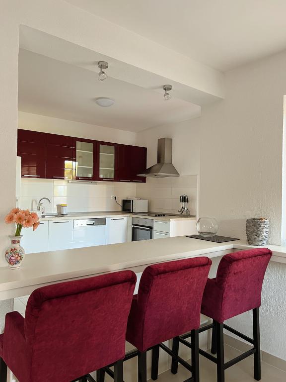 Ta čudovita vila, ki se nahaja v prvi vrsti do morja, ponuja popolno kombinacijo miru in sprostitve, obdana z velikim bujnim vrtom in čudovitim pogledom na goro Biokovo. Sprostite se na prostorni terasi ali balkonih, obdani s čudovitimi cvetovi bugenvilije in visokimi palmami. Villa Ilaria sestavljata dva udobna in prostorna popolnoma opremljena apartmaja, ki vam bosta zagotovila prijeten dopust. Stanovanje v pritličju vključuje teraso in dvorišče pred vilo z možnostjo uporabe zunanjega zidanega žara, stanovanje v prvem nadstropju pa vam nudi tri balkone s pogledom na morje. Brezplačno zasebno parkirišče je na voljo na dvorišču zadaj. Po želji nudimo tudi najem celotnega objekta večjim skupinam. Lokalne restavracije in kavarne, pekarna, lokalna stojnica s sadjem in zelenjavo, trgovine s spominki in različni izleti so na voljo v nekaj minutah hoje.