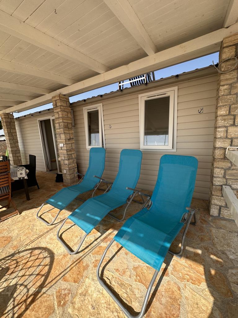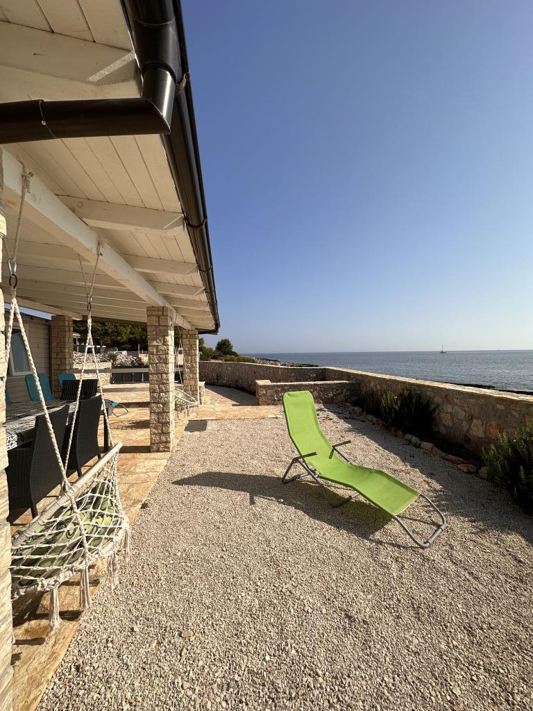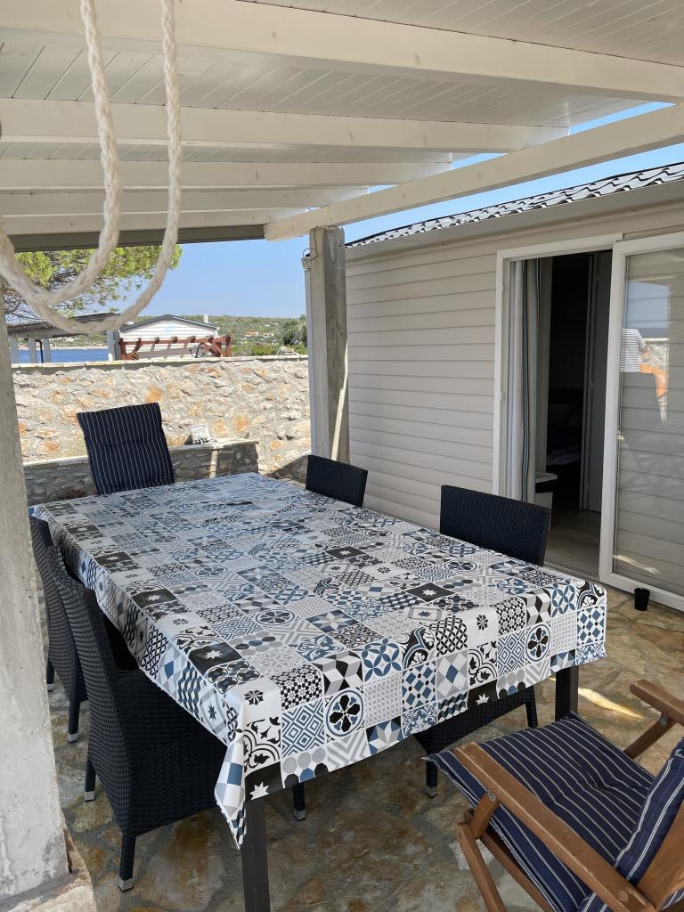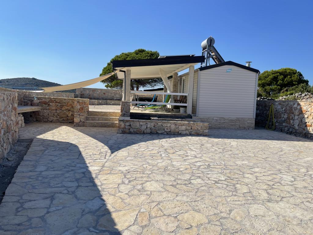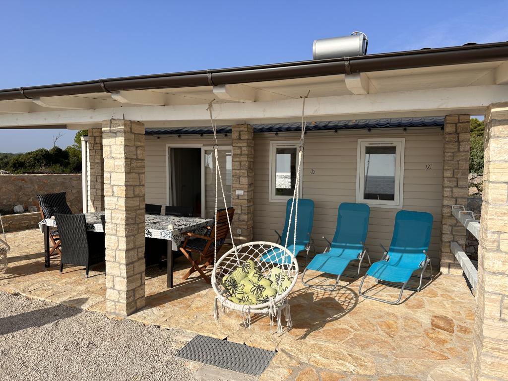 Moderno opremljena mobilna hišica z vso potrebno opremo, le 10 metrov od morja. Popoln za uživanje v miru in pogledu na morje. Pravljični sončni zahodi na prostrani terasi ob morju so prava oaza miru. Hiša je sestavljena iz dveh dvoposteljnih sob, kuhinje z jedilnico in raztegljivim kavčem ter prostorne, popolnoma opremljene kopalnice. Hiša je opremljena s sončnimi kolektorji, klimo, mikrovalovno pečico, hladilnikom z zamrzovalnikom, zunanjim in notranjim tušem, plinskim žarom. Tekoča voda iz cisterne. Vodo in elektriko je treba uporabljati varčno. Dostop do hiše je možen z avtomobilom in ima zasebno brezplačno parkirišče. Prostoren vrt 200m2 z lastnim dostopom do morja. 500m od hiše se nahaja edinstvena peščena plaža Vela Rina, kjer se nahaja beach bar in taverna.