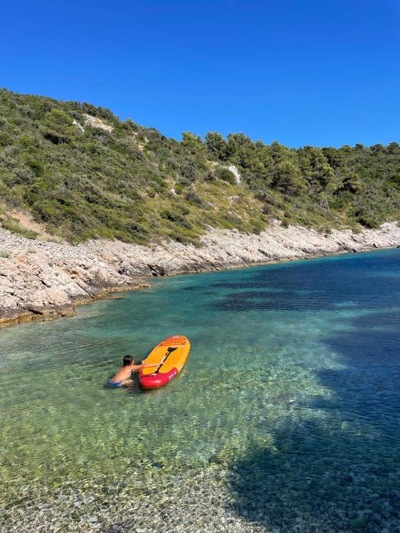 Kuhinja je popolnoma opremljena s posodo in osnovnimi aparati. Poleg tega ima hiša sol, poper, olje, kis, nekaj litrov ustekleničene pitne vode. Na voljo so tudi detergent za pomivanje posode, čistila, milo za roke in toaletni papir. Okoli hiše rastejo nekatere začimbe (rožmarin, komarček, lovorjev list, žajbelj, meta in druga aromatična dalmatinska zelišča). Seveda so za vas pripravljene posteljnina, odeje in brisače. Za tiste, ki uživajo v bolj aktivnih počitnicah, je na voljo tudi deska za veslanje stoje (SUP).