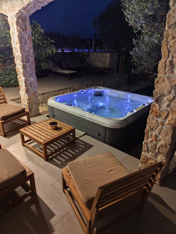 Čudovit, naraven in miren kraj. Hiša z jacuzzijem za najem na Drveniku Malem, približno 150 metrov od morja. Hiša je sestavljena iz dveh spalnic, dnevne sobe s kuhinjo in jedilnico ter kopalnice. Najlepši del hiše je terasa z odprtim kaminom - kamnitim žarom. Drvenik Mali je obdan z bistrimi vodami Jadranskega morja, otoka v bližini mesta Trogir in mesta Split. Povezan je z majhnim trajektom, ki v sezoni pluje štirikrat na dan. Drvenik Mali je zelo miren otok, toliko miru, edinstvene naravne lepote in izjemno čistega morja. To je popolna počitniška destinacija "daleč od mestne gneče" in je pravi izziv za vse sodobne Robinsonce. Če iščete bujno sredozemsko vegetacijo, izvirno vzdušje in pristno otoško vzdušje, je Drvenik Mali prava izbira za vas.