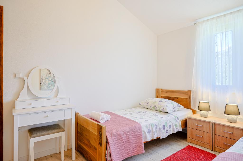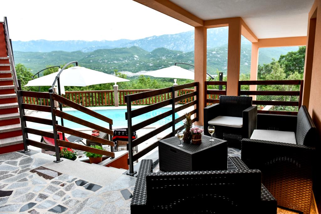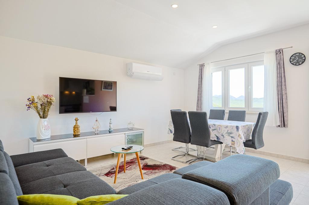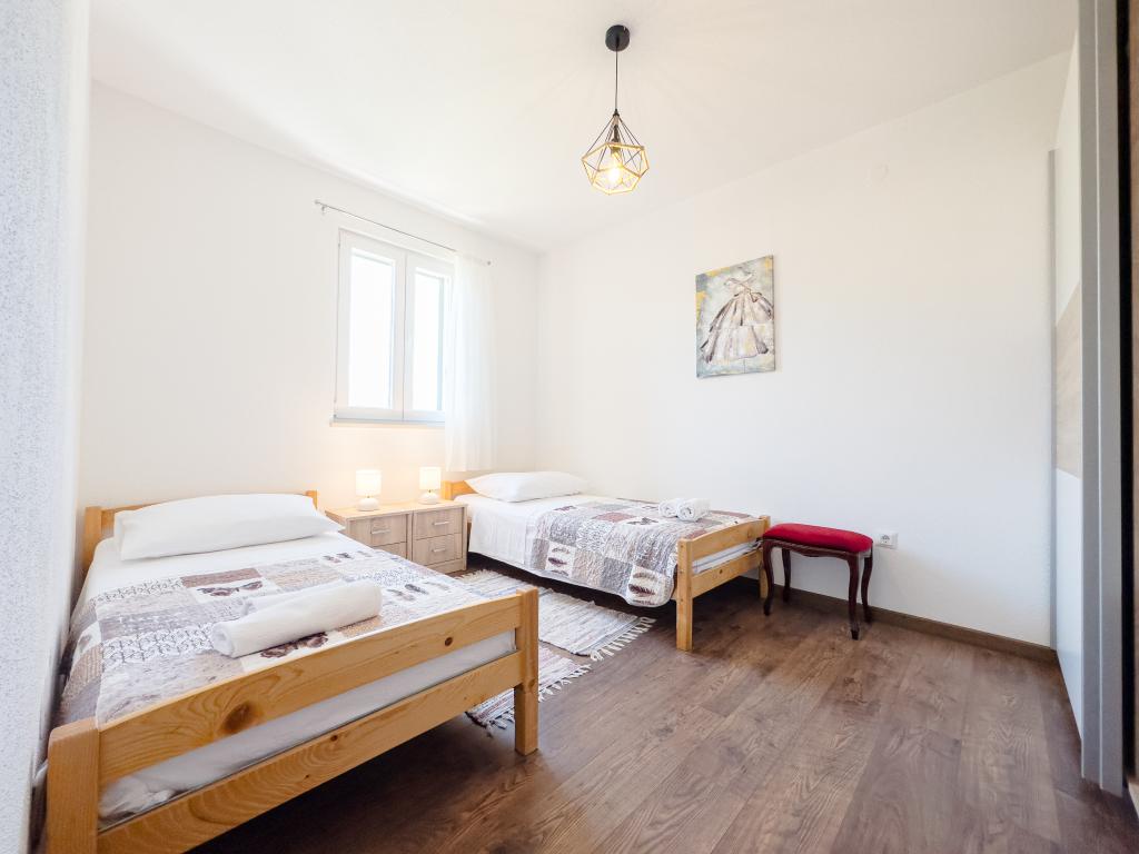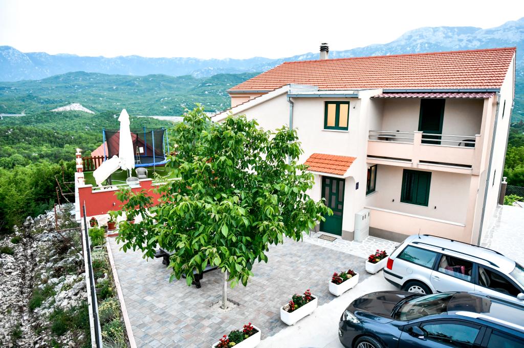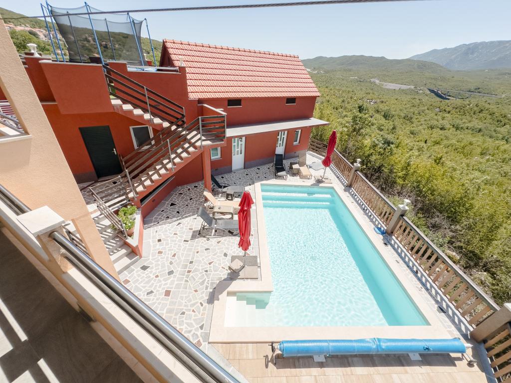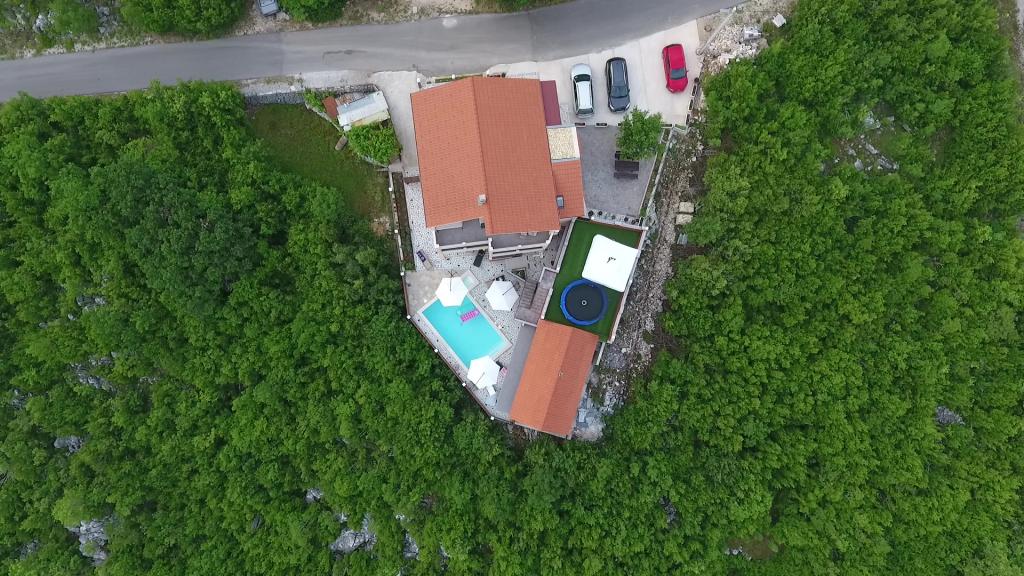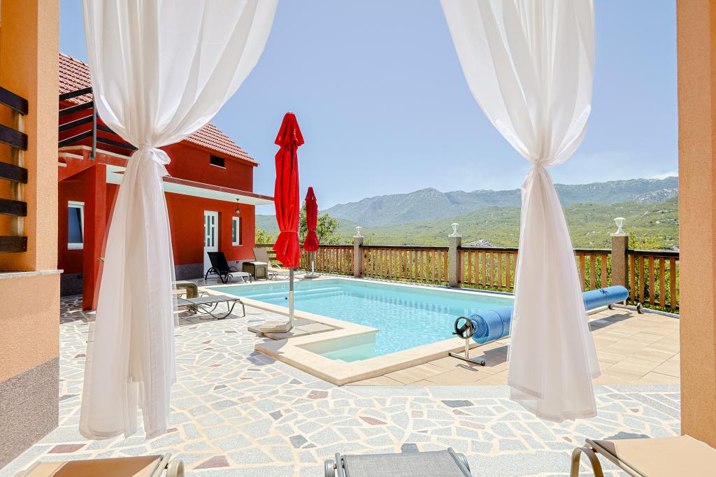 Prostorna počitniška hiša bo poskrbela za popolno uživanje in sprostitev za 12 oseb. Prostoren vrt z ogrevanim bazenom velikosti 7 x 4 metre z vodno in zračno masažo za zabavo in sprostitev. Ob bazenu je letna kuhinja z jedilnico in kopalnico, v sklopu katere je tudi zunanji žar. Vsak apartma ima 3 spalnice, 2 kopalnici, popolnoma opremljeno kuhinjo, prostorne dnevne sobe s pametnimi televizorji in balkone s pogledom na bazen in goro Biokovo. Ponudba vključuje trampolin za najmlajše, notranji žar, 5 parkirnih mest in veliko teraso. Edinstvenost te nepremičnine je v tem, da se hiša nahaja na samem, zato ste lahko prepričani, da boste uživali v popolni zasebnosti. Lokacija hiše je odlična, saj je 25 minut vožnje do Jadranskega morja, 10 minut vožnje do trgovin, kavarn in restavracij. Mesta Makarska, Imotski, Split, Omiš, Međugorje, Makarska in druge privlačne lokacije so od nas oddaljene manj kot 20 minut do 1 ure vožnje. Vhod na avtocesto je oddaljen 9 km.