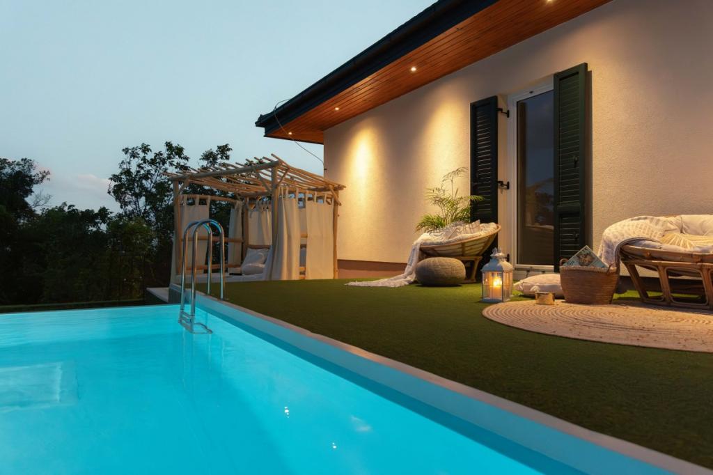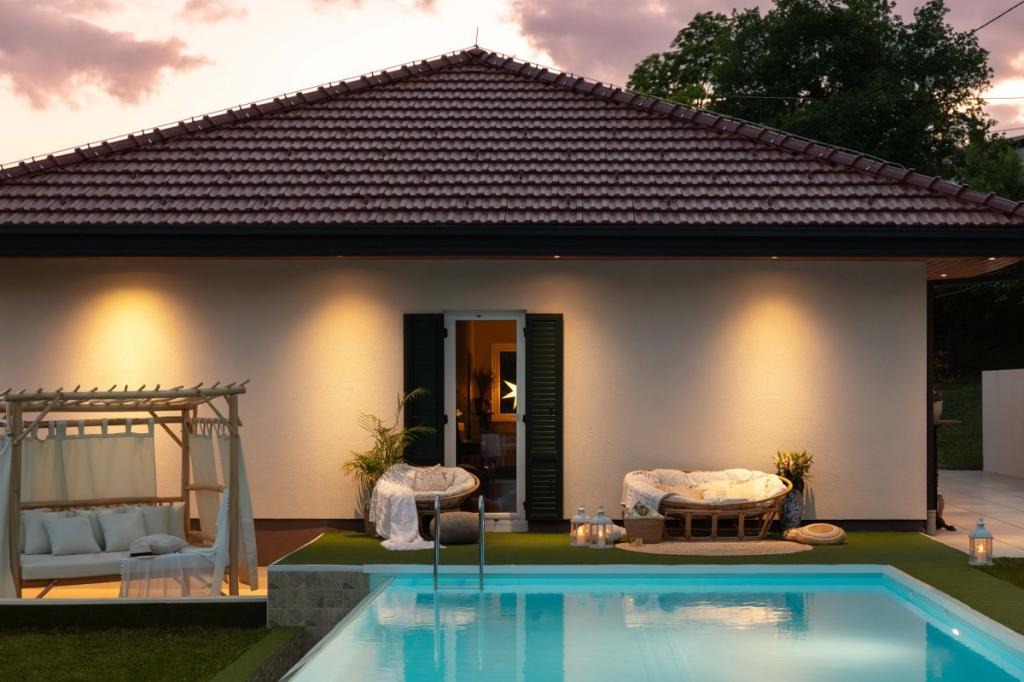 Villa Plešivica view je kombinacija tradicionalnega, lokalnega in modernega, industrijskega stila, ki je obdan z neokrnjeno naravo. Posebna pozornost je namenjena detajlom, ki dajejo vili eleganco, zračnost in toplino. Čeprav gre za novogradnjo, je bila leta 2022 popolnoma prenovljena. Sestavljen je iz edinstvene predsobe, prostorne dnevne sobe, dveh spalnic, ločene kuhinje, dveh veličastnih kopalnic in pozne terase. Posebnost te vile so steklene plošče, ki ponujajo odprt pogled na nebo in pravljična pobočja vinogradov in sadovnjakov. Okolišče same vile je sestavljeno iz prelivajočega se bazena, štirih različnih teras in očarljivega gazeba. Vse našteto uokvirja preko 3.000 m2 travnatih površin, obrobljenih z avtohtonim sadnim drevjem in bogato vegetacijo. Vila ponuja tudi spa & wellness oazo. Sama dekoracija vile je eklektična in predstavlja kombinacijo sodobnega dizajnerskega pohištva v kombinaciji z obnovljenimi art deco in art nouveau deli, ki so del družinske dediščine.