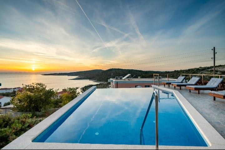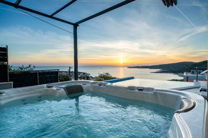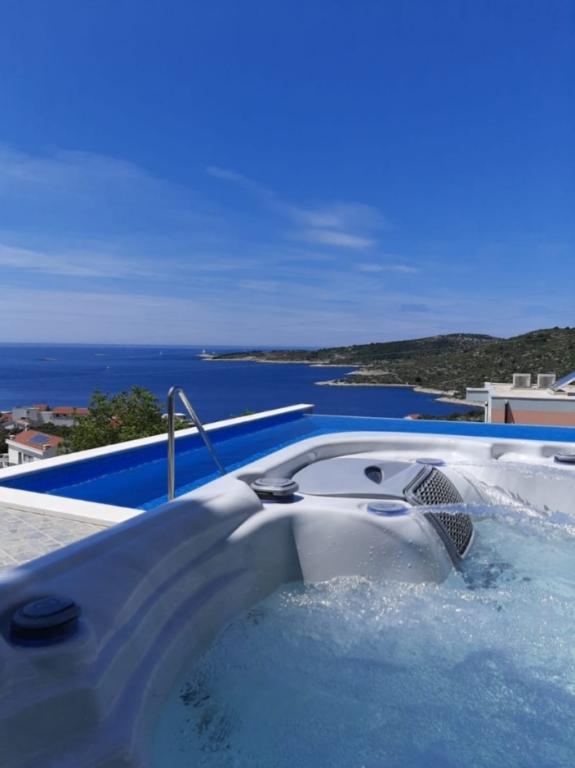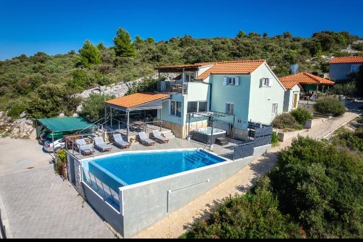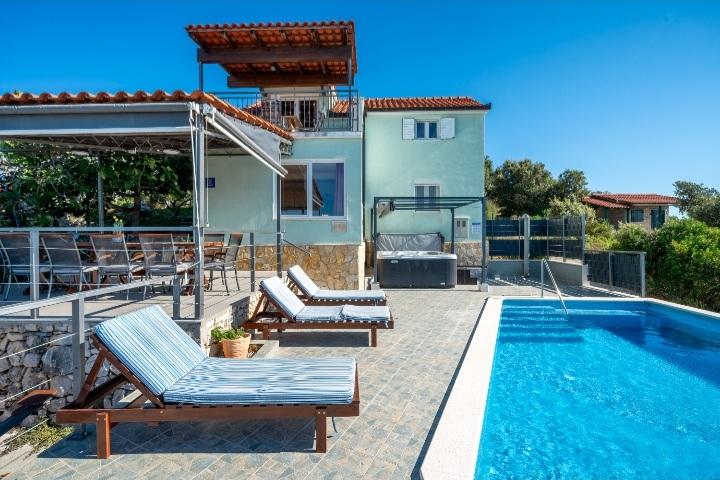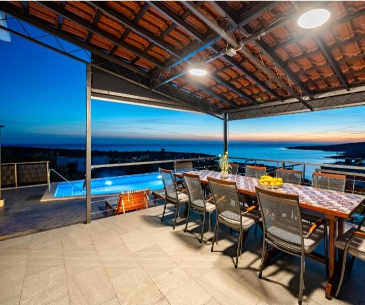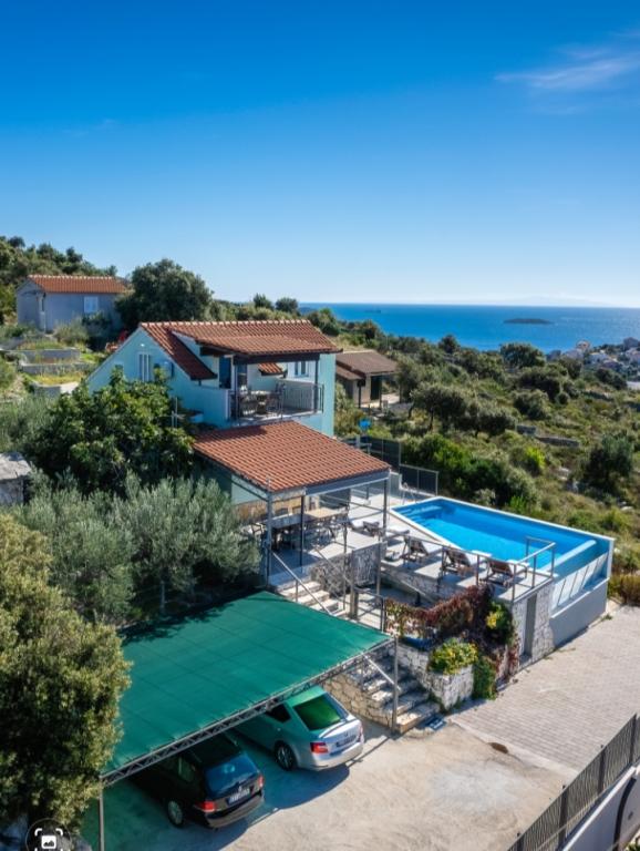 Počitniška hiša z bazenom in ogrevano masažno kadjo se nahaja na hribu s čudovitim pogledom na odprto morje. Idealen je za miren oddih za veliko družino ali skupino prijateljev. Hkrati so lahko dostopni športni in zabavni objekti; urejene kolesarske poti, peščene, betonske in prodnate plaže ob kristalno čistem morju. Restavracije in nočni klubi so oddaljeni 5 do 10 minut vožnje z avtomobilom. Hiša ima skupno deset ležišč in dva raztegljiva kavča, dve moderni kuhinji, dve kopalnici in dva WC-ja. Kuhinje so opremljene s posodo za pripravo in s priborom za serviranje obrokov. V eni kuhinji je pomivalni stroj, aparat za kavo, mikrovalovna pečica, kuhalnik vode, toaster. Gostom sta na voljo dve pokriti terasi, velika odprta terasa ob bazenu, žar, parkirišče za tri avtomobile, bazen (40 m2), ležalniki, zunanji tuš in ograjeno igrišče za otroke. Končno čiščenje, klima, vzdrževanje bazena, turistična taksa in internet so vključeni v ceno. Dobrodošli!
