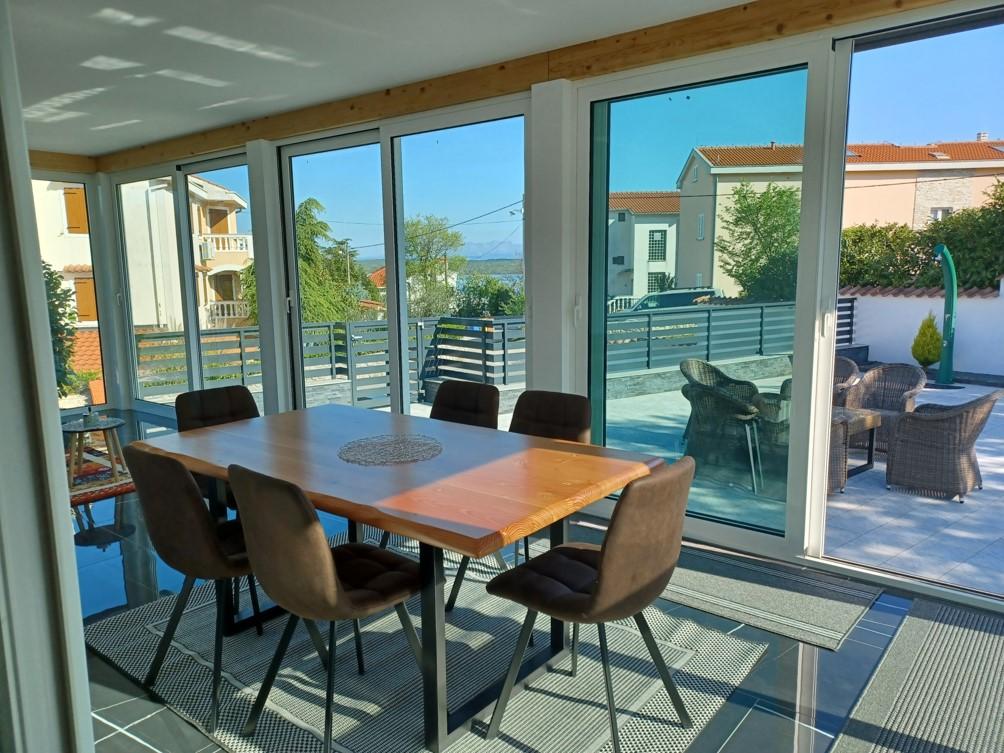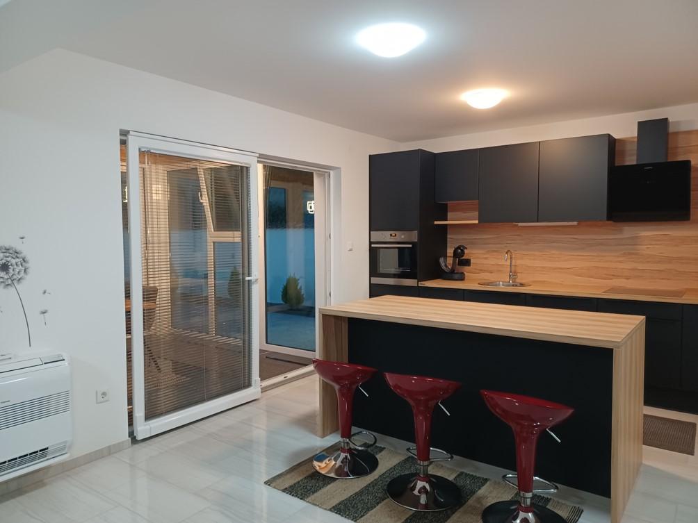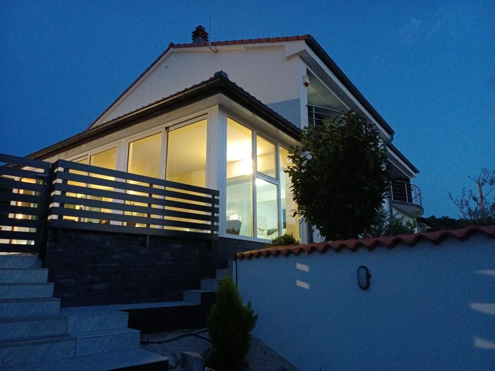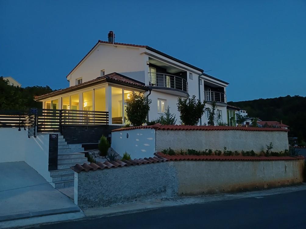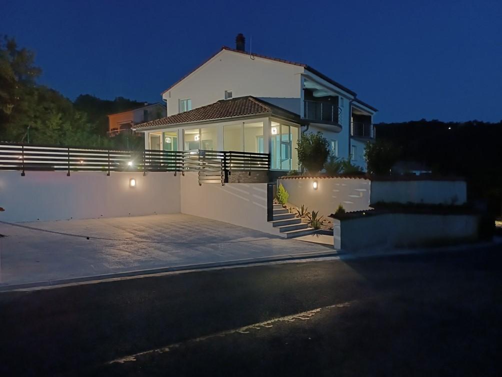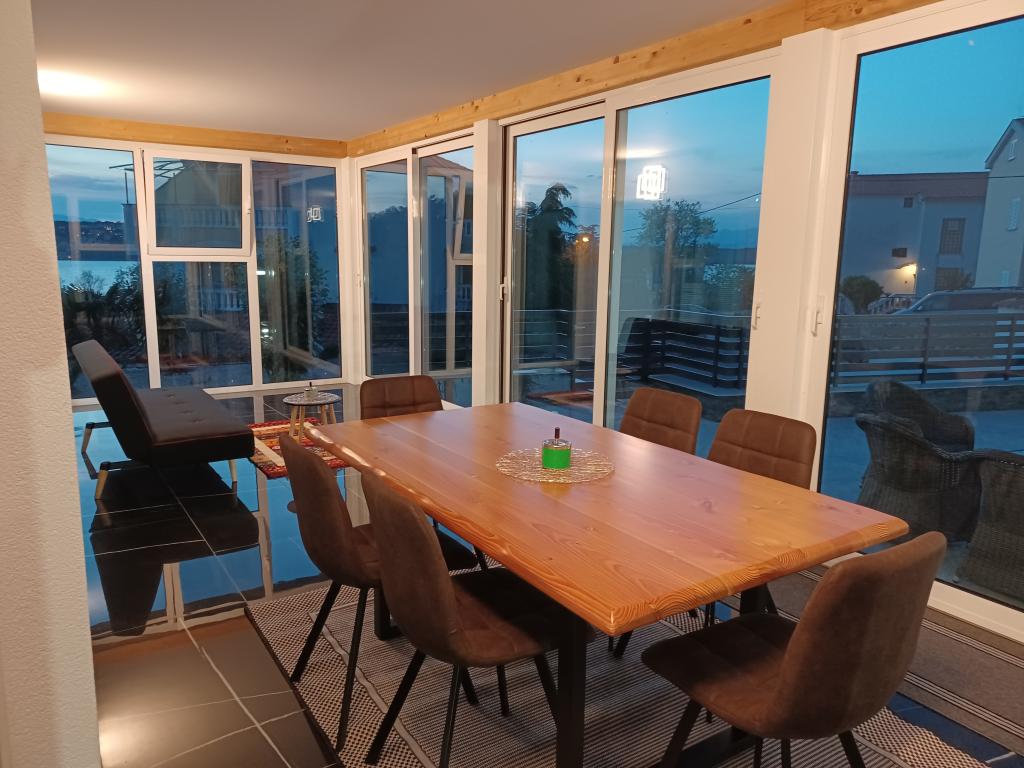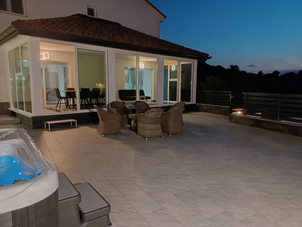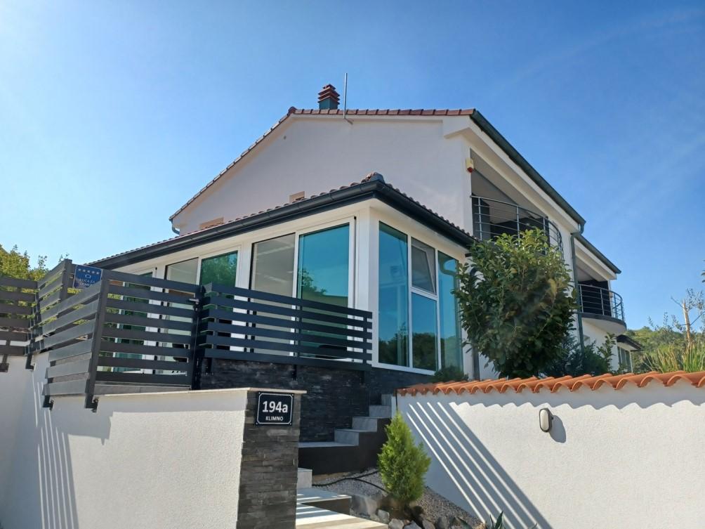 Počitniška hiša se nahaja v Klimnu, na vzhodni strani otoka Krk, le 10 minut vožnje od Krškega mostu. S svojo staro turistično tradicijo je Klimno poznano po bogati gostinski ponudbi v restavracijah, ki ponujajo morske jedi in druge specialitete z obveznim avtohtonim vinom, apartmajih in zasebnih vilah. 100 metrov od plaže v mirnem mestu Klimno na otoku Krku se nahaja luksuzna hiša s 5* velikosti 200 m2 z velikim hidromasažnim bazenom za 6 oseb, prostorom za sončenje in vrtom. Če želite letos preživeti počitnice v popolni zasebnosti s pridihom luksuza in v bližini morja, izberite to počitniško hišo, ki ima vse, kar potrebujete za prijetno in brezskrbno bivanje. V zgornjem nadstropju so 3 dvoposteljne sobe z lastnimi kopalnicami, televizorji, vsaka soba pa ima izhod na balkon. Jutra lahko začnete s pogledom na sončen zaliv. V pritličju se nahajata moderno opremljena kuhinja in dnevna soba, ki se odpirata na lepo pokrito zastekljeno teraso in zunanji prostor.