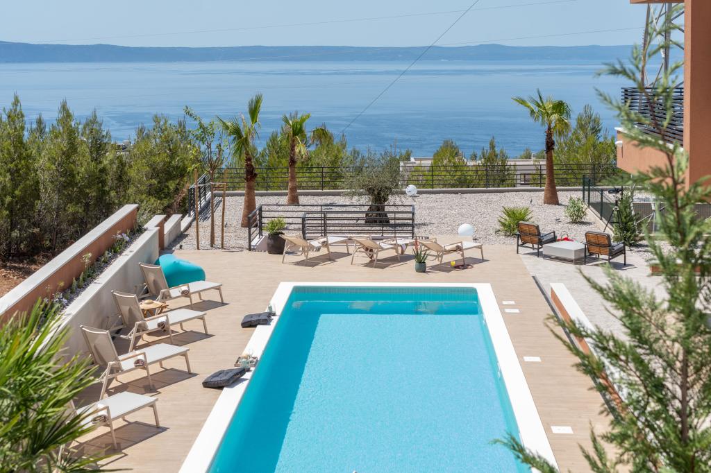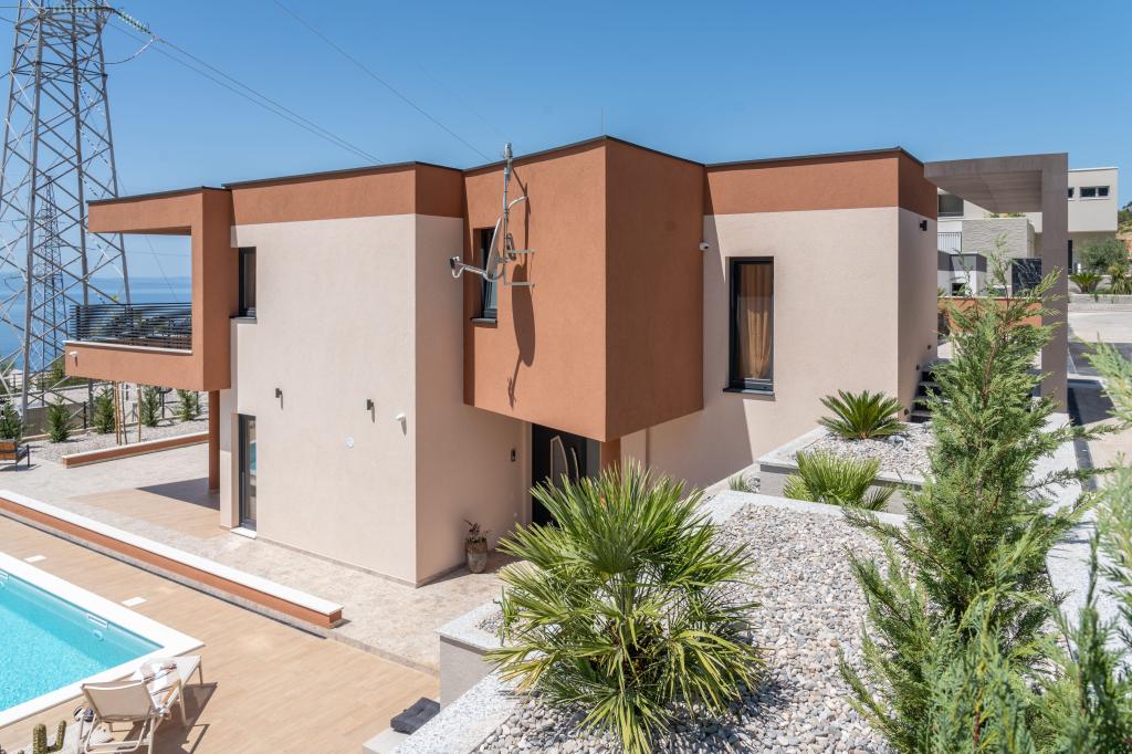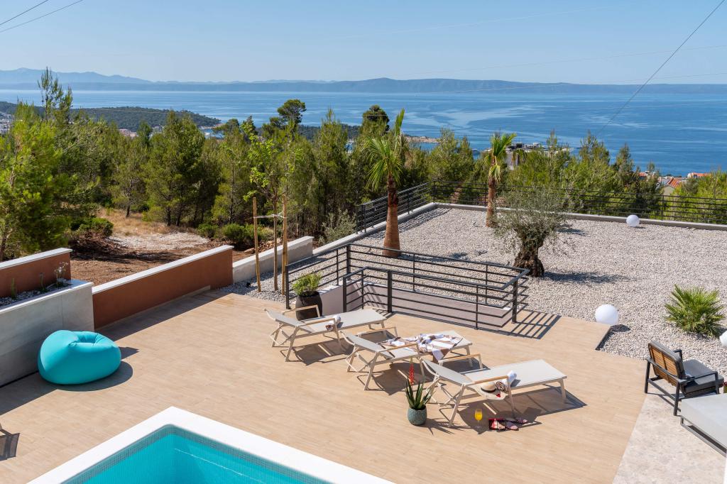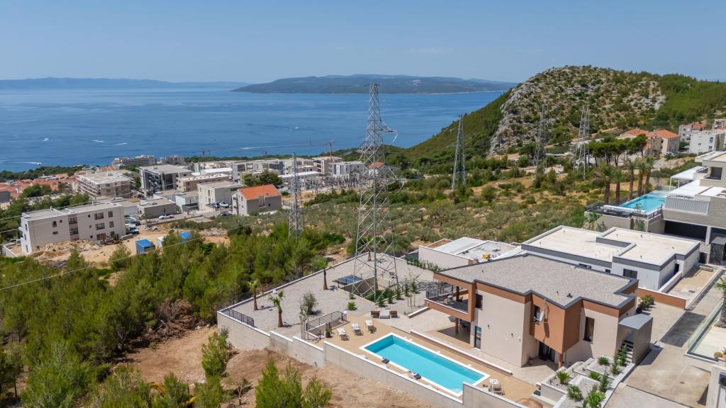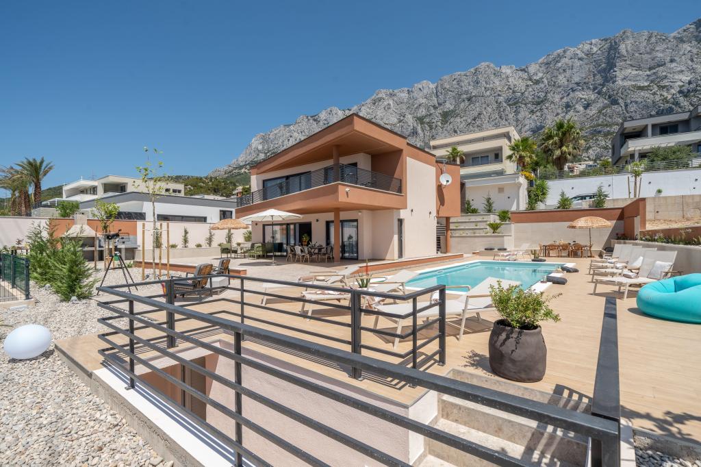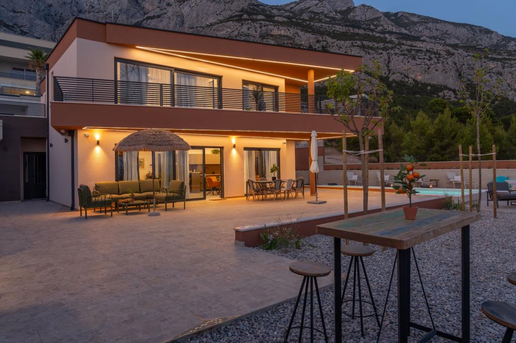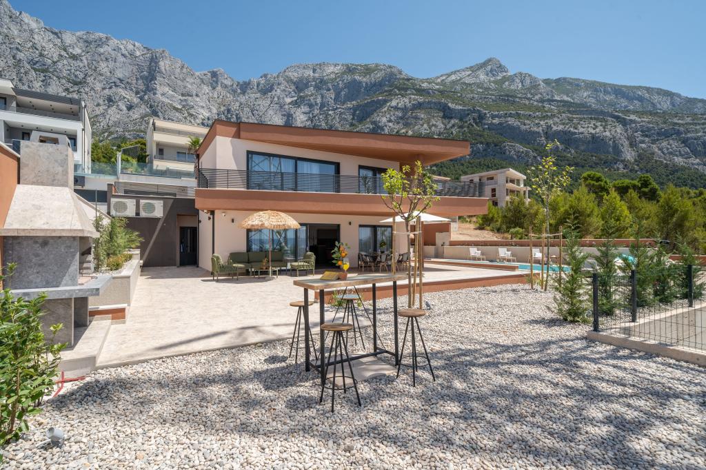 Moderna vila s spektakularnim panoramskim razgledom na azurno morje in velikansko goro Biokovo - prava luksuzna oaza za družine ali skupine do 8 srečnežev! Uživajte v zasebnem bazenu za osvežilno kopanje, žaru za nepozabne večere in prostornem zunanjem salonu, ki je kot nalašč za sprostitev, romantične trenutke ali vesele družinske večerje pod zvezdami. Vaše sanje v Dalmaciji vas čakajo!