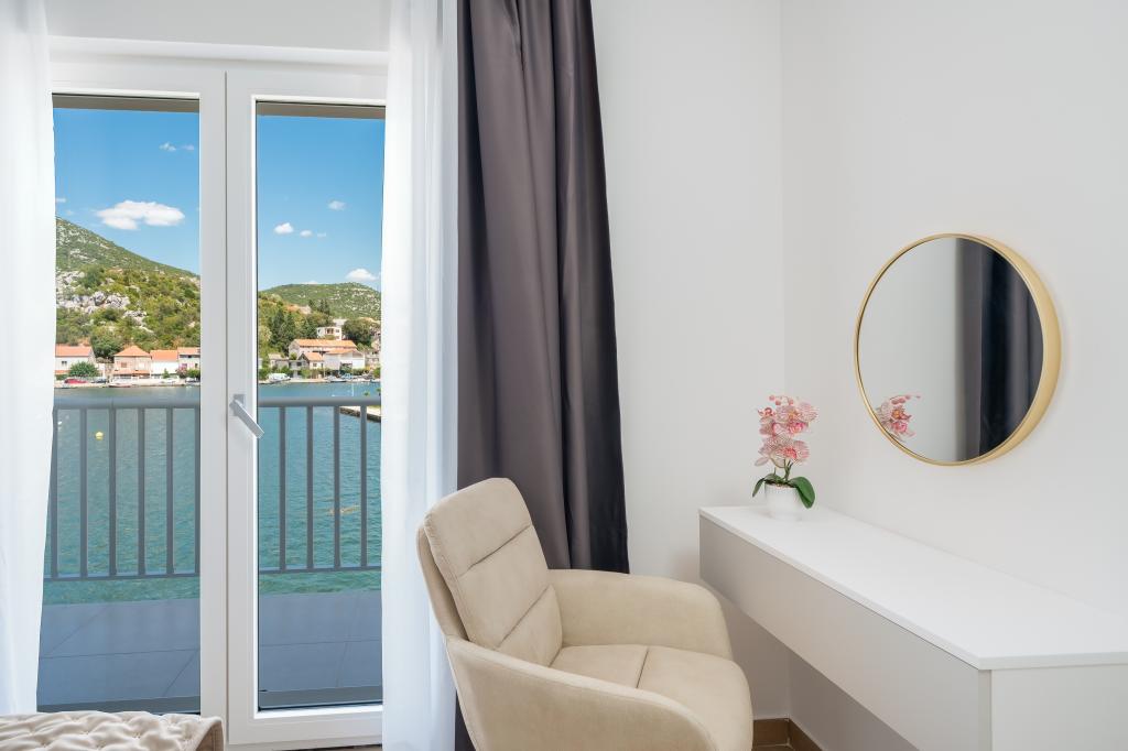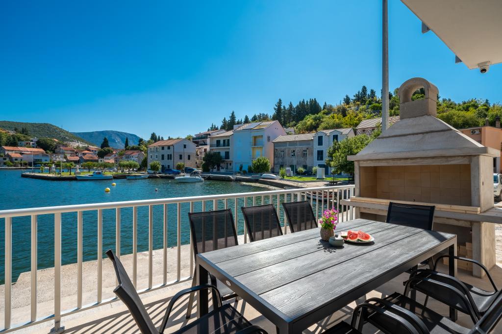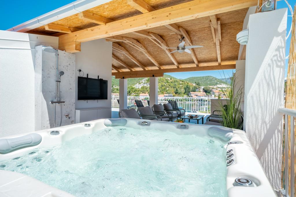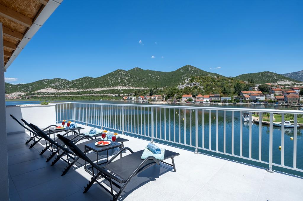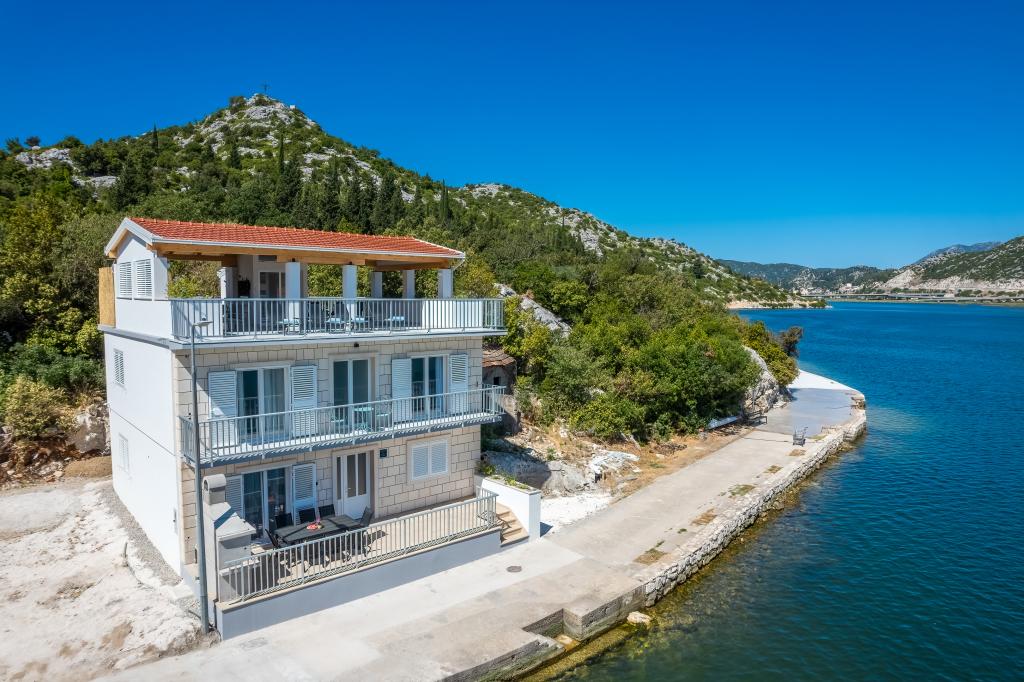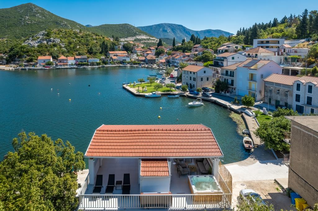 Popolnoma in moderno opremljena vila, kjer bivate samo vi, z ogrevanim jacuzzijem, 3 m od morja in 30 m od plaže. Vila ima teraso z zunanjo jedilnico in zasebnim kaminom, 4 sobe po 15 m2, vse klimatizirane in imajo čudovit razgled ter dostop do balkona. Na strehi je 110 m2 velika terasa z zunanjim tušem, ogrevanim jacuzzijem ter prostorom za sedenje in druženje. S terase in balkona je čudovit razgled na zaliv in mesto. Vila ima brezplačen brezžični internet in brezplačno zasebno parkirišče. Kuhinja je opremljena z vsemi gospodinjskimi aparati. Vila se nahaja 32 km od slapa Kravica. 42 km od vile je Hrib prikazovanj v Međugorju, 10 km od vile pa so Bačinska jezera in ustje Neretve, idealno za deskarje.