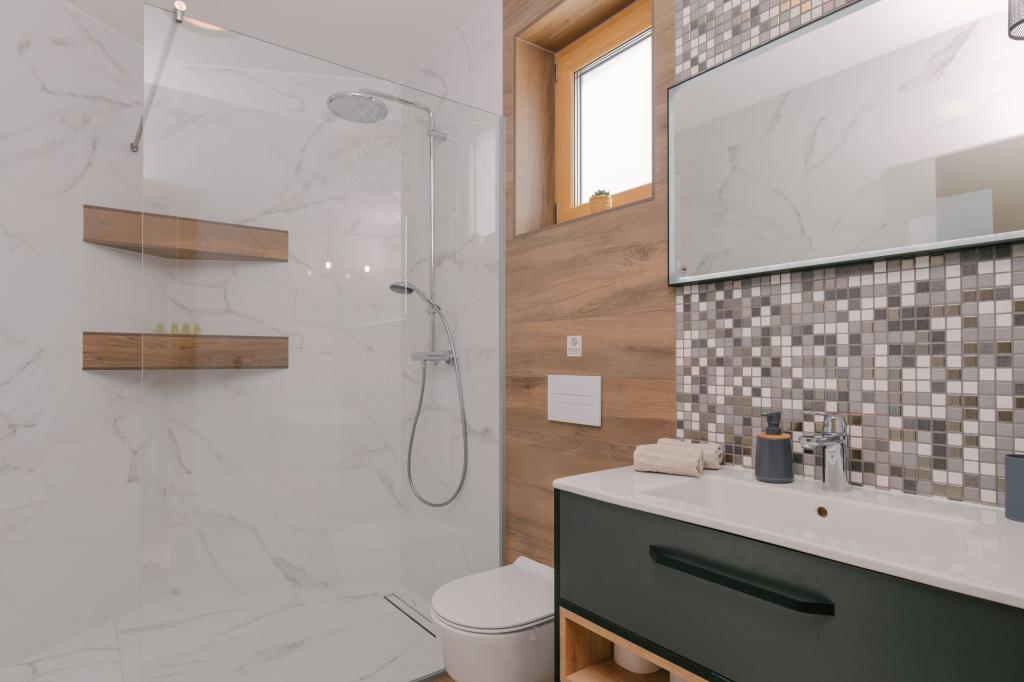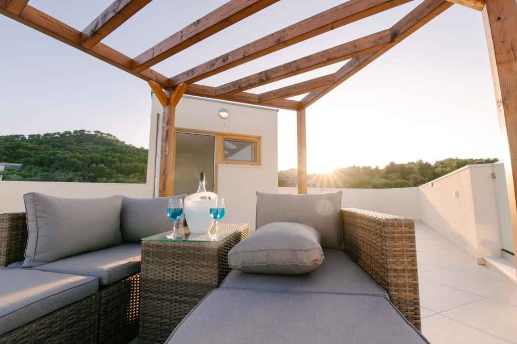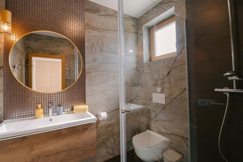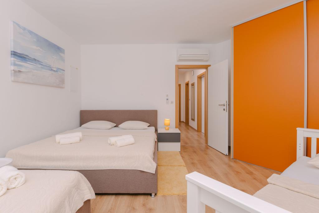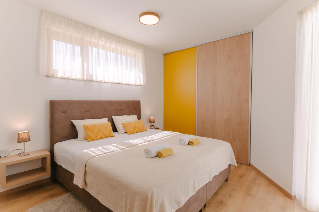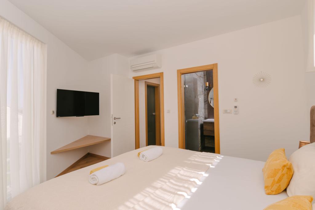 Tri moderne glavne spalnice se nahajajo v zgornjem nadstropju, ena soba za goste pa v kleti. Vse kopalnice so opremljene z vrhunskimi armaturami Grohe in Laufen, prestižnimi dizajnerskimi keramičnimi ploščicami in elegantnimi steklenimi vrati. Hiša je uradno kategorizirana s strani Ministrstva za turizem Republike Hrvaške, kar omogoča udobno namestitev za 9, celo 10 gostov. Dnevna soba in jedilnica odprtega tipa ter vsaka spalnica so opremljene z individualnimi klimatskimi napravami s tihim načinom, kar je idealno za miren spanec. Moderna kuhinja znane avstrijske blagovne znamke DanKüchen je v celoti opremljena z vrhunskimi aparati, vključno s hladilnikom z ledomatom in dozatorjem hladne vode.