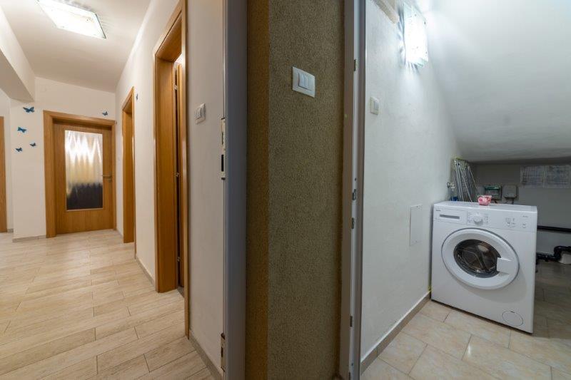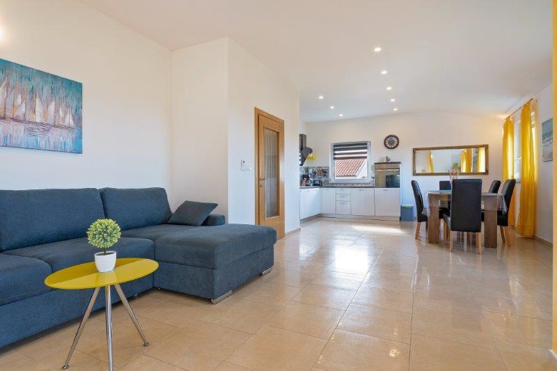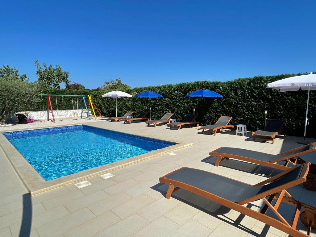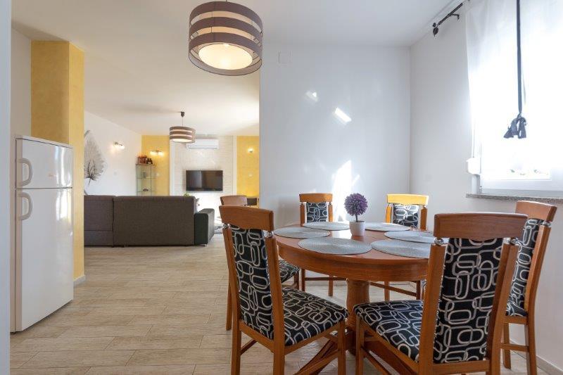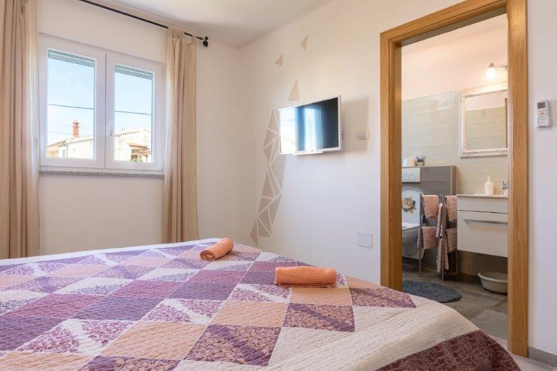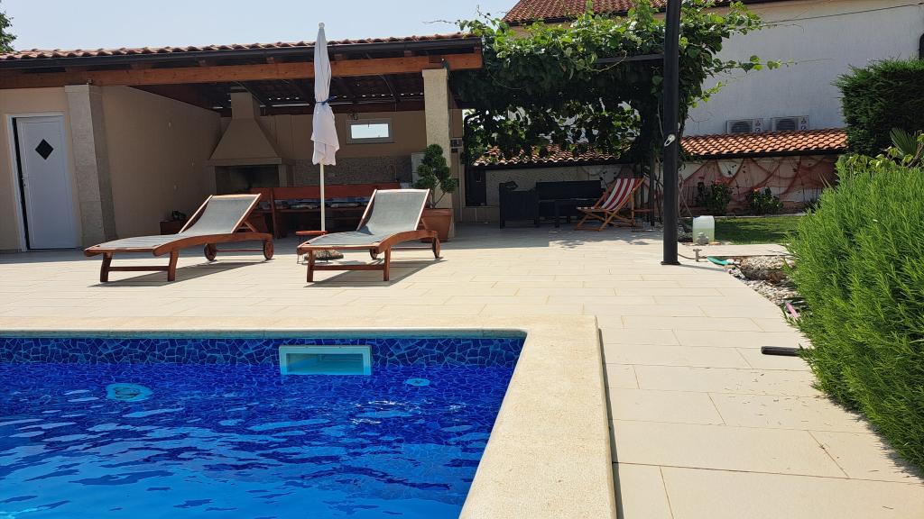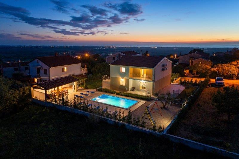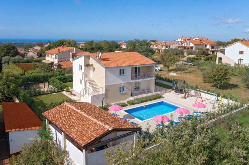 Nahajamo se v mestecu Kaštelir, 10 km od Poreča. Hiša je sestavljena iz dveh ločenih apartmajev, enega v pritličju, drugega v prvem nadstropju, hiša se oddaja kot celota. Vsak apartma je sestavljen iz dnevne sobe, kuhinje, dveh spalnic, vsaka s svojo kopalnico. Vsak apartma ima 3 klimatske naprave, eno v dnevni sobi in eno v vsaki sobi. Apartma je opremljen z vsem potrebnim za prijetno bivanje. Zunaj je otroško igrišče z gugalnicami, trampolinom in mizo za namizni tenis. Dvorišče je popolnoma ograjeno, tako da lahko pripeljete svojega psa, zaračunamo 12 eur na dan za pse. Zunaj imamo tudi bazen 8*4m, ležalnike, senčnike in letno kuhinjo z žarom. Pred apartmajem imamo 6 parkirnih mest, od tega sta 2 pokriti zaradi drugih obveznosti pri nas v juliju in avgustu možna rezervacija samo od nedelje do nedelje, v ostalih mesecih pa je minimalno 5 dni in čas prihoda je lahko katerikoli dan v tednu. Hiša je idealna za 8 oseb, lahko pa sprejme tudi 10 oseb. Za dodatno osebo imamo doplačilo 25 € na osebo.