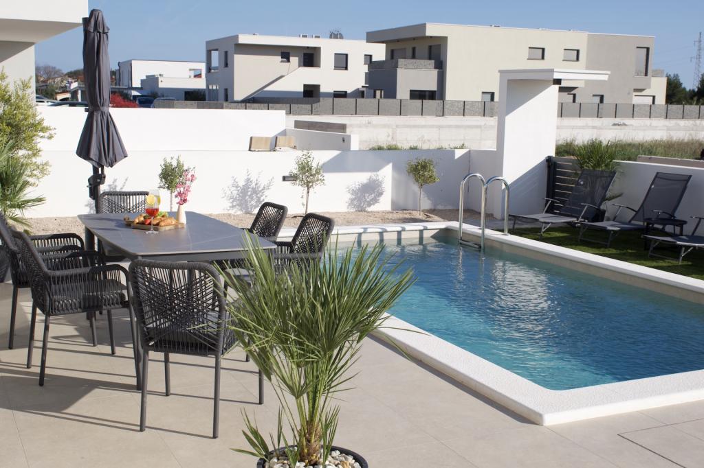 Popolnoma opremljena vila z bazenom, žarom in otroškim igriščem. Nahaja se približno 1 km od centra mesta v mirni soseski.