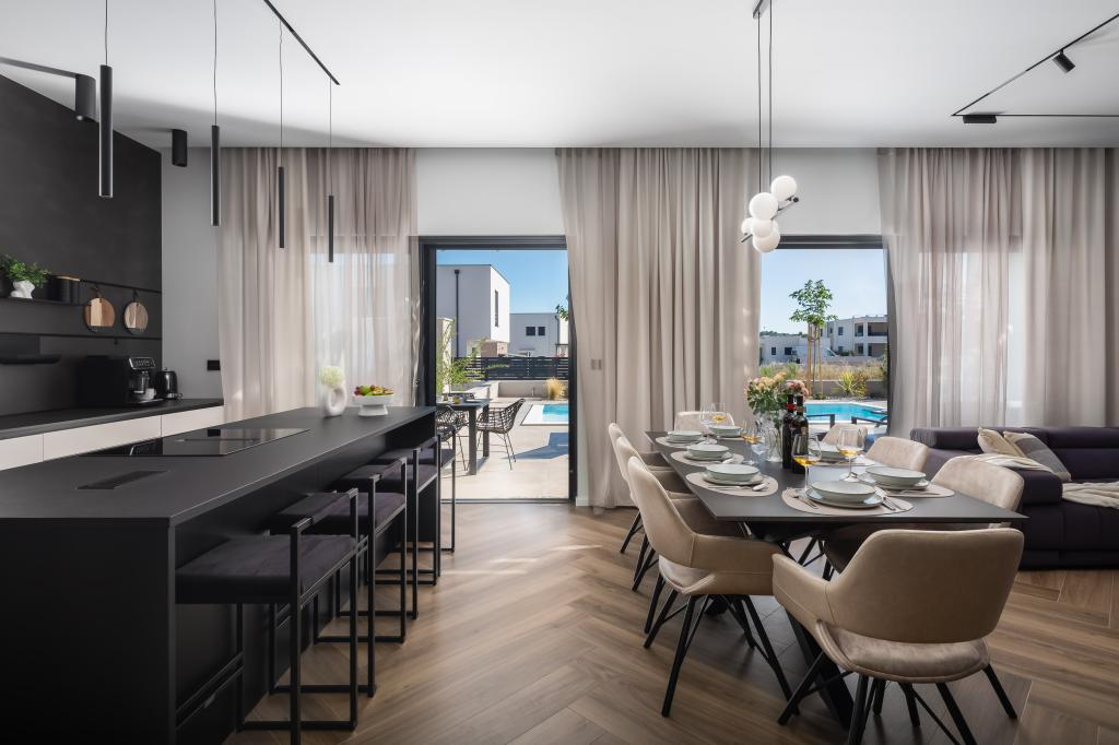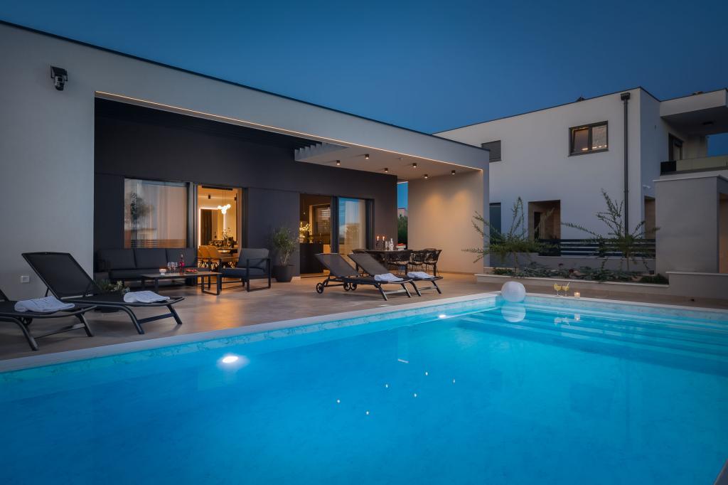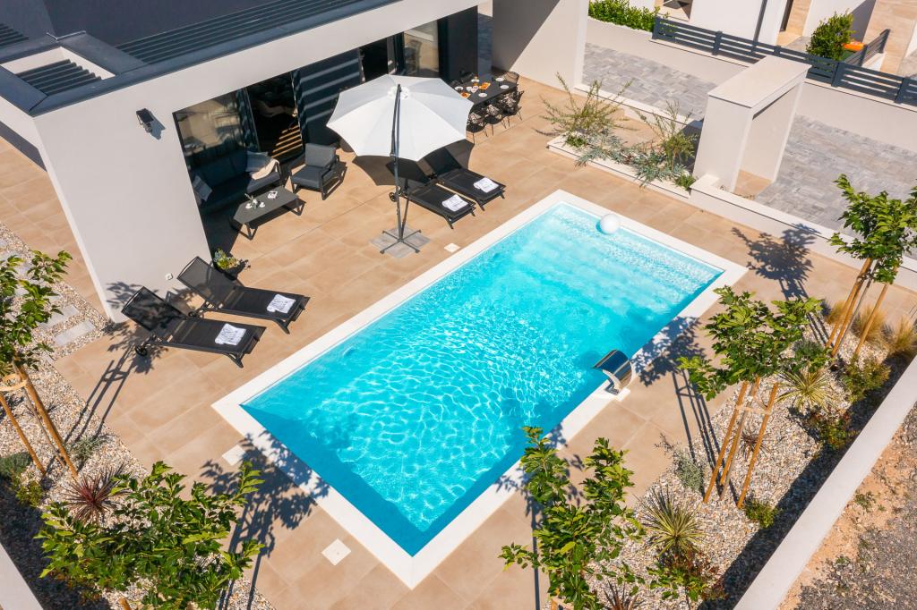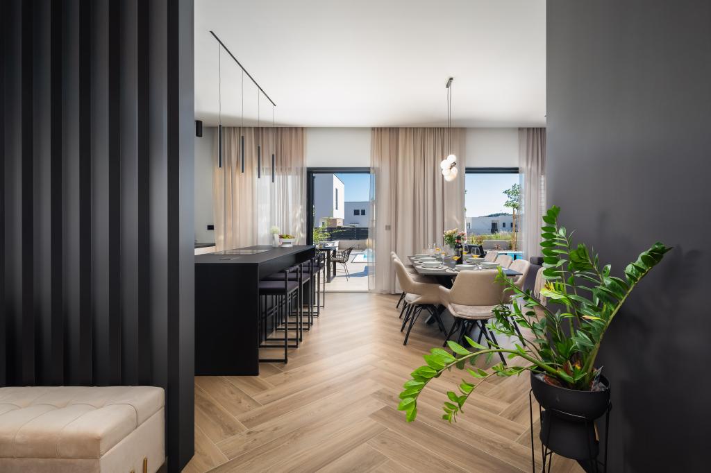Čudovito urejena moderna vila v Vodicah v mirni vasici, idealna za vaše počitnice. Hiša je enonadstropna, z odprtim prostorom velike kuhinje in prostorne dnevne sobe z udobnim kavčem. Vila ima 3 spalnice s kopalnicami. Sprostite se lahko na prostorni terasi ob bazenu in uživate v pripravljenih jedeh z žara. Vila je ograjena.