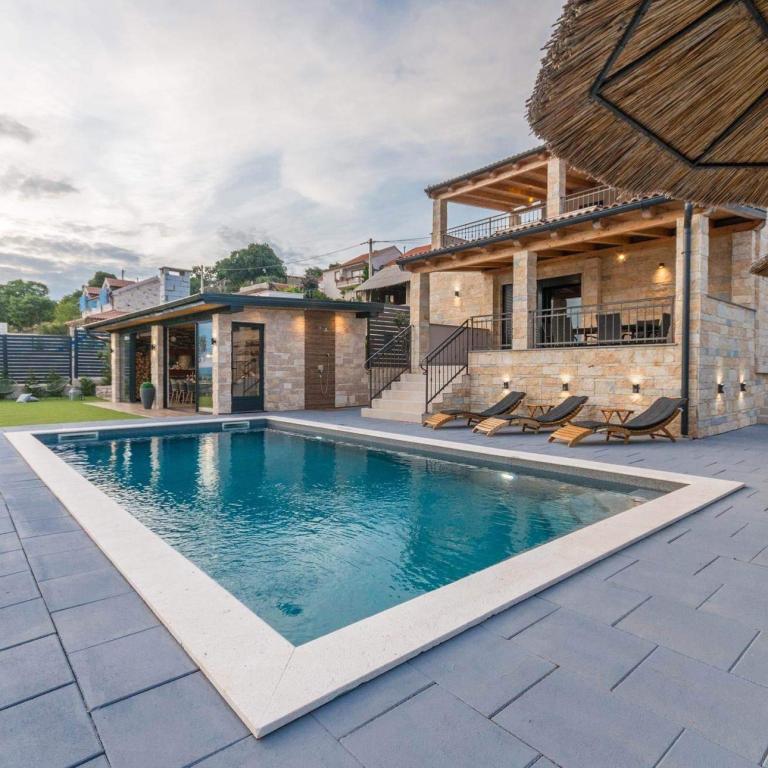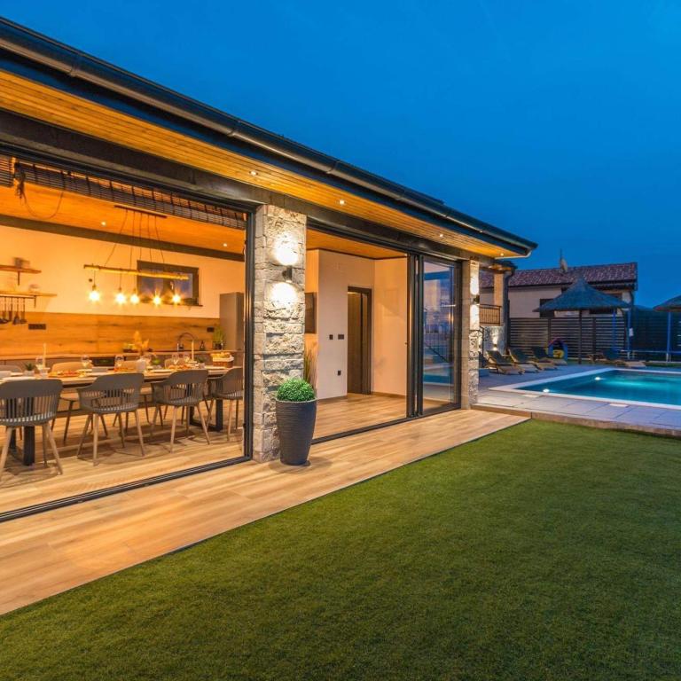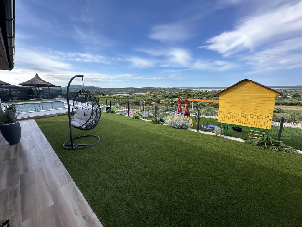 Na čudoviti lokaciji v bližini naravnega parka Vransko jezero se nahaja Vila La Vrana. Edinstvena lokacija te nepremičnine vas bo pustila brez sape s slikovitim razgledom na jezero in morje. S svojimi 130 m2 lahko sprejme 8 oseb v 3 moderno opremljenih spalnicah. V prvem nadstropju vile sta 2 spalnici in kopalnica s kadjo. V pritličju se nahaja razkošno opremljena dnevna soba s čudovitim razgledom na okolico, moderno opremljena kuhinja z jedilnico. V dnevni sobi je kavč, ki lahko služi kot dodatno ležišče za 2 osebi. V pritličju se nahaja tudi ena spalnica z zakonsko posteljo in kopalnica s tušem. Na dvorišču vile se nahaja bazen velikosti 8x4 m, ki je ogrevan v predsezoni in posezoni, na voljo pa so ležalniki in brisače za bazen. V vili je brezplačno parkiranje, polnilna postaja za avtomobile in veliko otroško igrišče. Ob vili se lahko sprostite in pripravite okusne obroke v letni kuhinji s popolnoma opremljenim žarom.